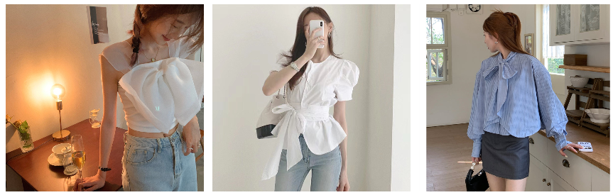 襟元のボウタイが程よいアクセントとなり、ブラウス全体のバランスが絶妙に保たれています。