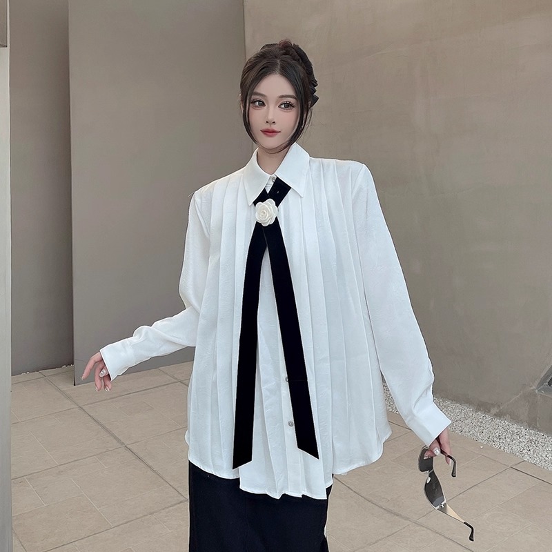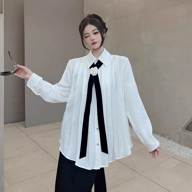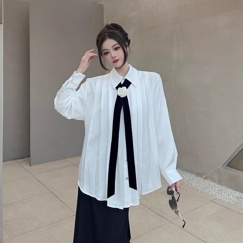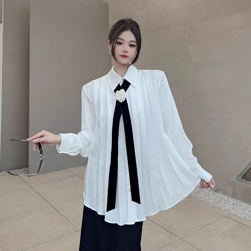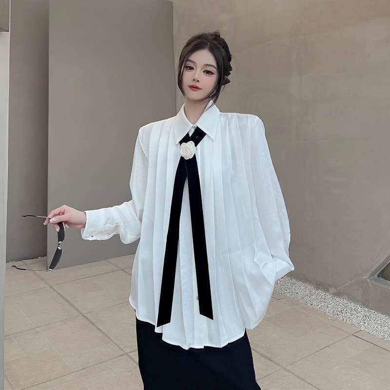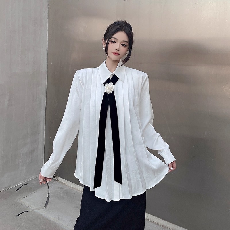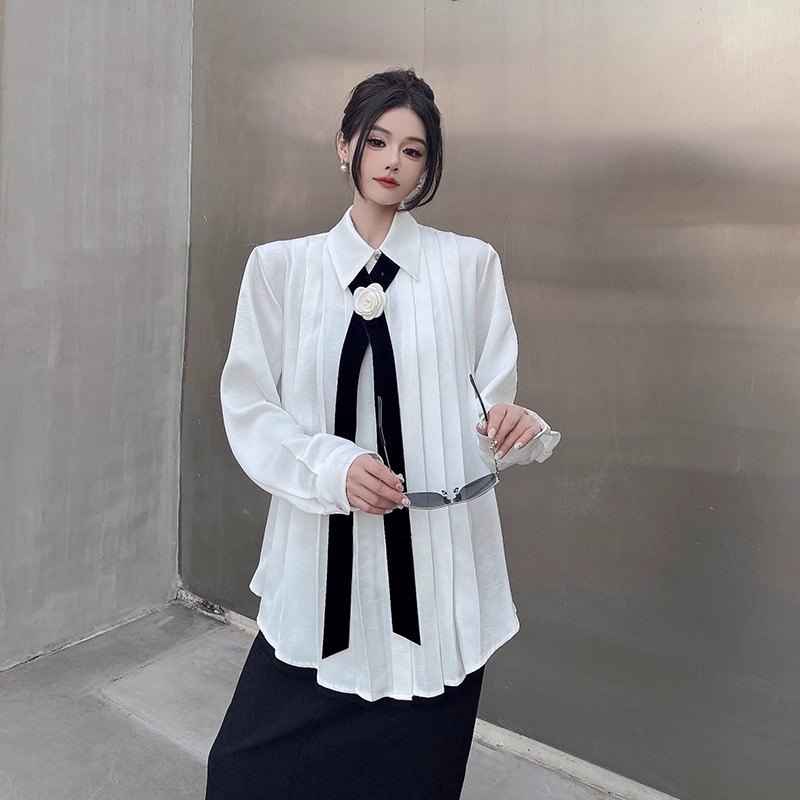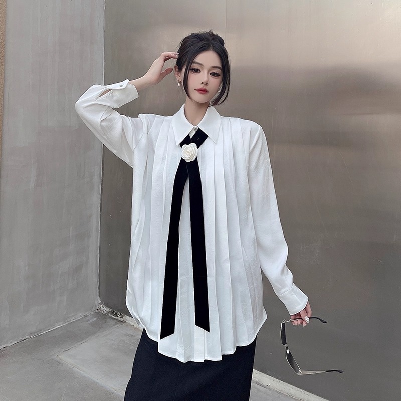 上品で洗練されたリボンブラウスです。胸元の黒いボウタイリボンがアクセントになり、