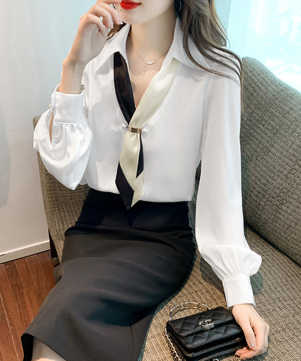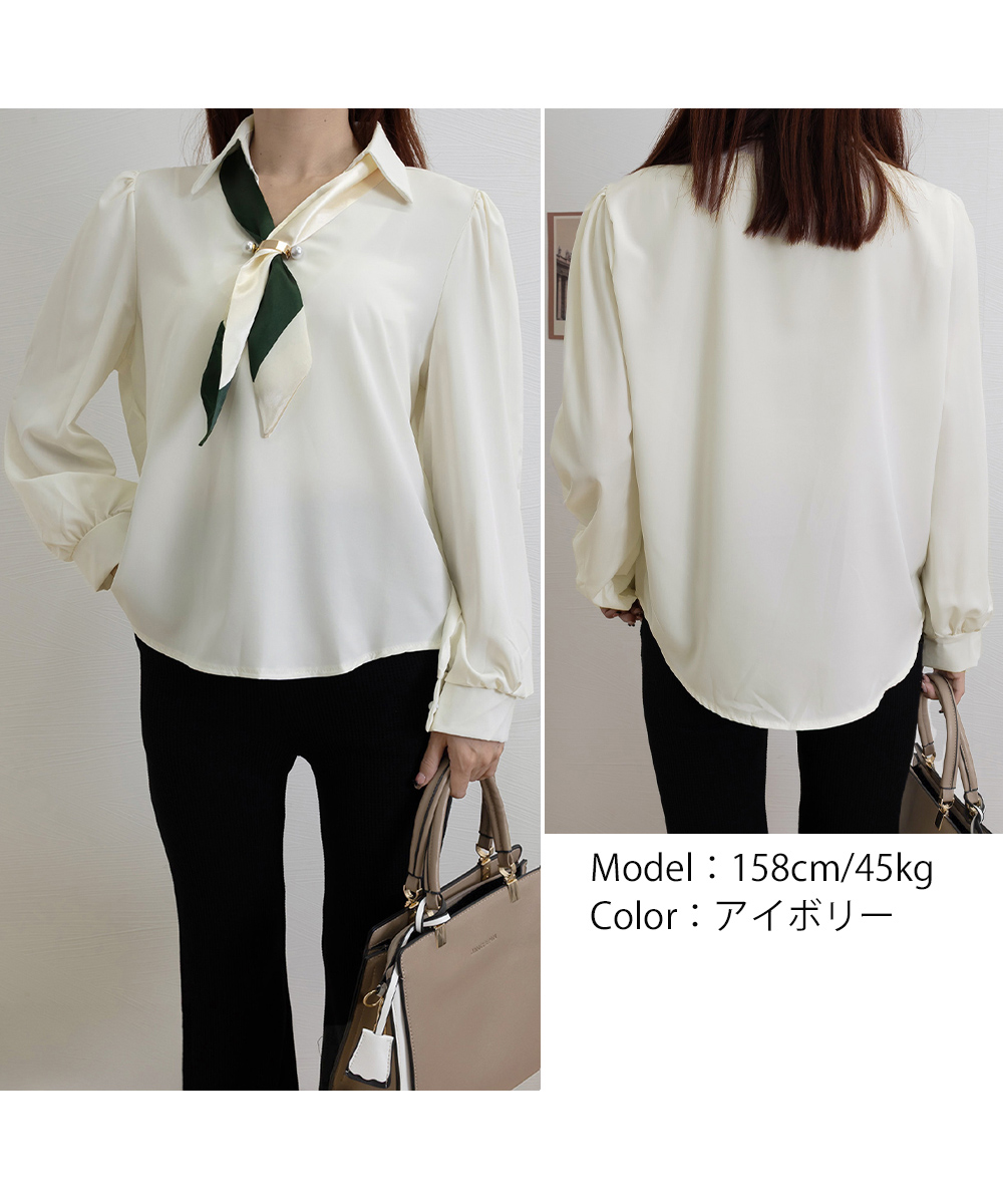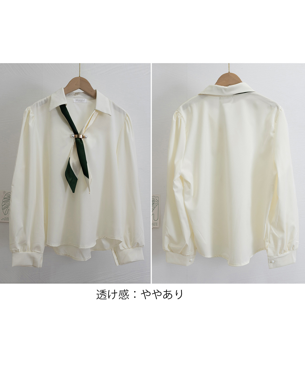 上品な配色ネクタイが魅力的なリボンブラウス。