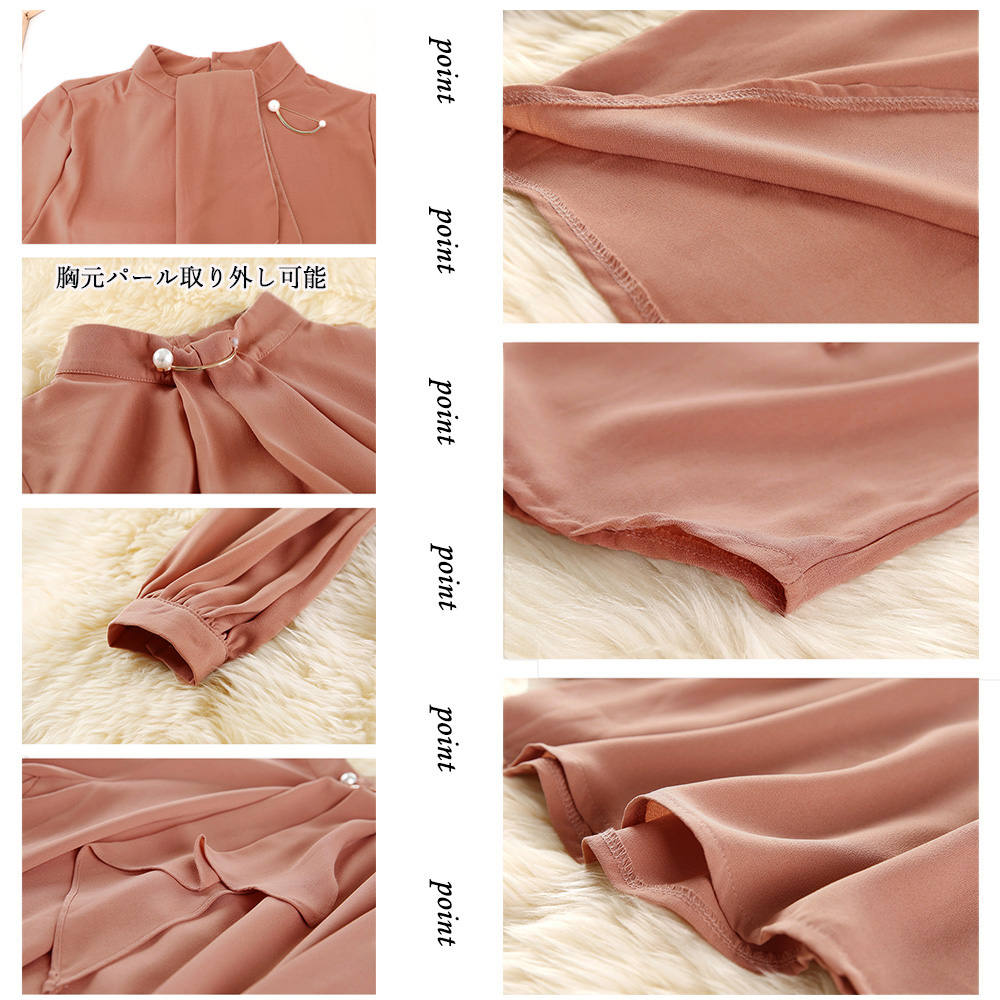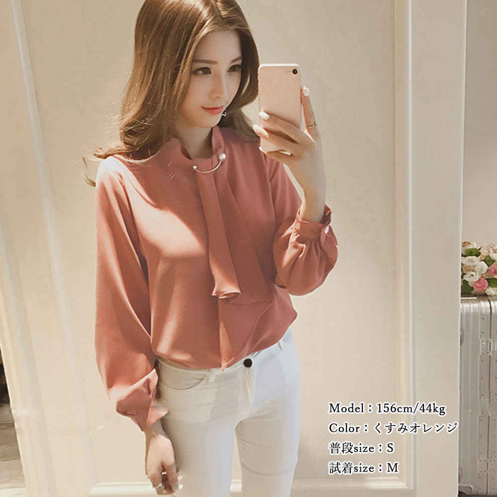 胸元のパール金具がアクセントの上品なリボンブラウス
