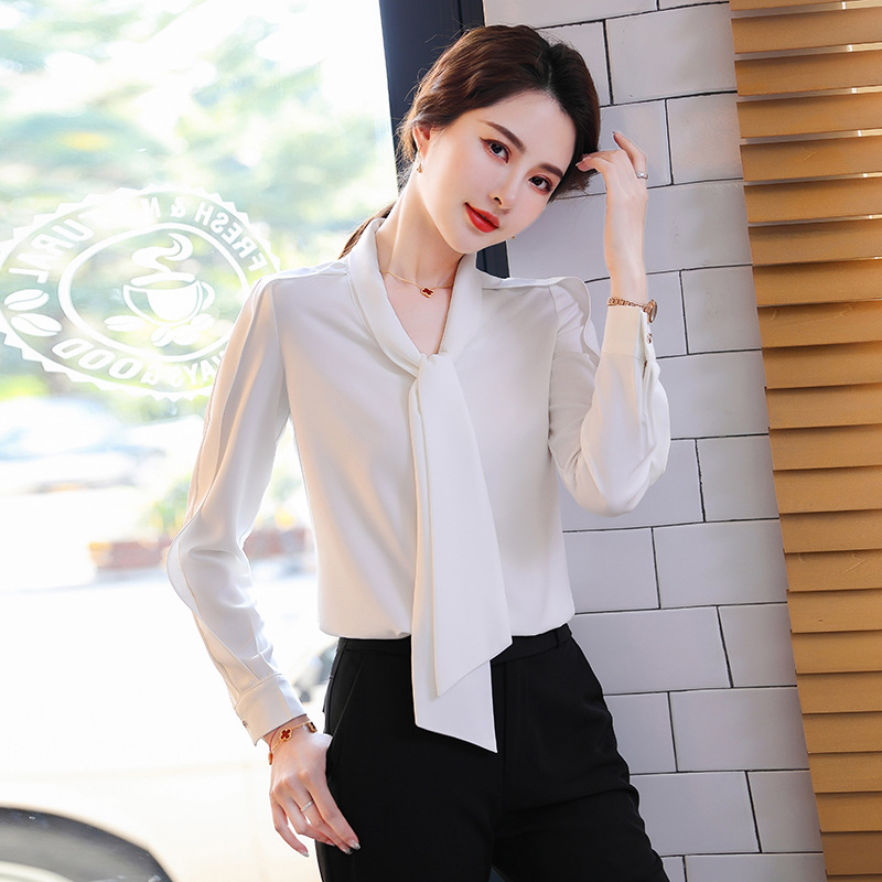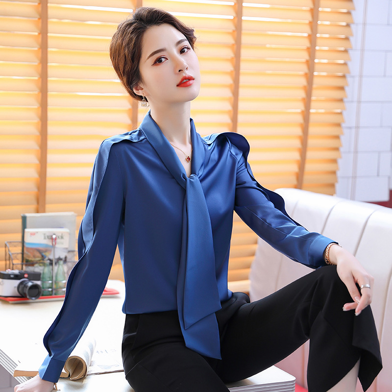 首元のボウタイリボンが女性らしさを引き立て、通勤からフォーマルシーンまで幅広く活躍します。