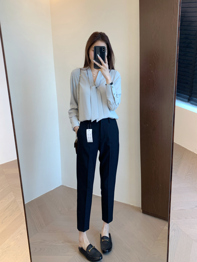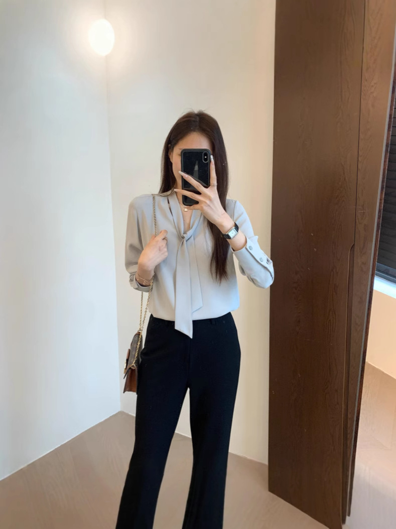 洗練された雰囲気を演出するリボンブラウスです。 首元のボウタイリボンが女性らしさを引き立て、オフィスシーンからフォーマルな場面まで幅広く活躍します。 ゆったりとしたシルエットで着心地も抜群、体型カバーにも効果的です。 長袖デザインで季節を問わず着用でき、パンツスタイルにもスカートスタイルにも合わせやすい万能アイテムです。 上質な素材感で高見えする一着をぜひワードローブに加えてください。