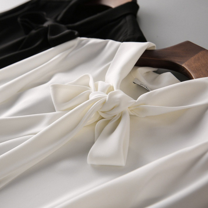 胸元の存在感あるビックリボンが印象的なリボンブラウスです。 上品な襟付きデザインで通勤やオフィスシーンにも最適です。 とろみのある柔らかな生地が女性らしさを引き立て、長袖でオールシーズン活躍します。 スカートやパンツとも相性抜群で、着回し力も抜群です。 一枚でコーディネートが華やぐエレガントな一着です。
