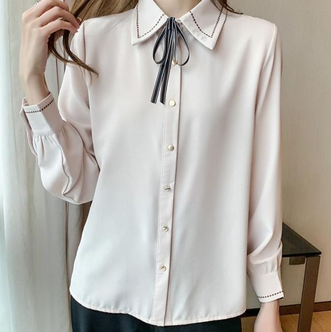 襟と袖口に施された繊細なステッチ配色が上品なアクセントを添えるリボンブラウスです。 胸元のボウタイリボンは長めの流れるようなデザインで、女性らしい優雅な印象を演出します。 ゆったりとしたバルーン袖とすっきりとした襟元のバランスが美しく、通勤からお出かけまで幅広いシーンで活躍します。 前開きボタンで着脱も楽々、きちんと感がありながらリラックスして着用できる一枚です。